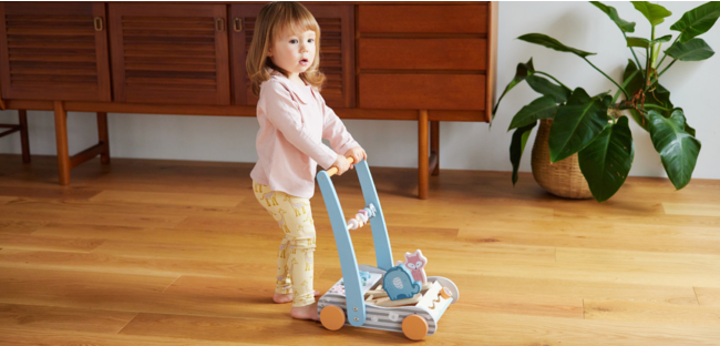 進むたびに、ぞうときつねのパネルがカタカタと音をたてて上下に動くベビーウォーカー。歯車やビーズなどのしかけがついているので、座ってじっくりと遊ぶこともできます。