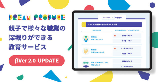キャリア教育×EdTech系スタートアップの株式会社Dream Produce(本社:東京都港区、CEO:中野誠仁、以下、Dream Produce Inc.)は、本日2022年11月22日に、親子で様々な職業を深掘りできるWebサービス『Dream Produce』をβ版Ver.2.0にバージョンアップ。本バージョンアップでは「キャリア能力通信簿」の機能追加、PCと併せてタブレットでのご利用にも対応したことをお知らせします。