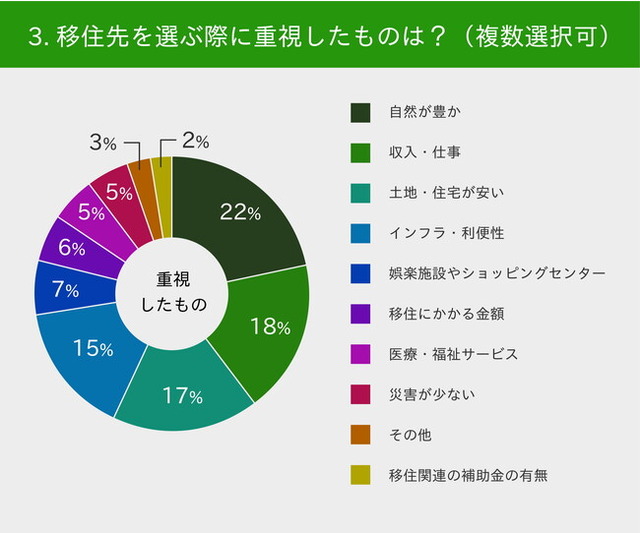 さらには、あまり多くないながらも「経済的な理由」を挙げた回答もありました(7%)。地方は不動産価格や住居費、税金などが比較的安く、地域によっては新鮮な食材も手に入りやすくなります。移住者への助成を実施している自治体もあり、収入が変わらなくとも暮らしの質が向上するケースは少なくありません。