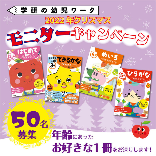 株式会社 学研ホールディングス(東京・品川/代表取締役社長:宮原博昭)のグループ会社、株式会社Gakken(東京・品川/代表取締役社長:五郎丸徹)は、2022年11月22日(火)よりInstagram「学研の幼児ワーク」2022年クリスマスモニターキャンペーンを実施いたします。