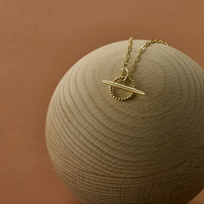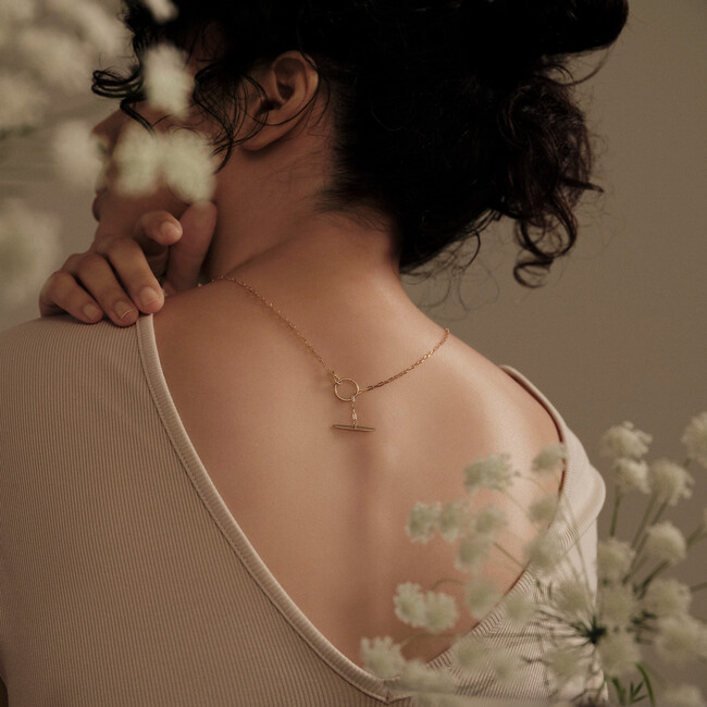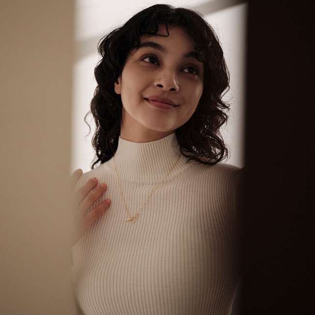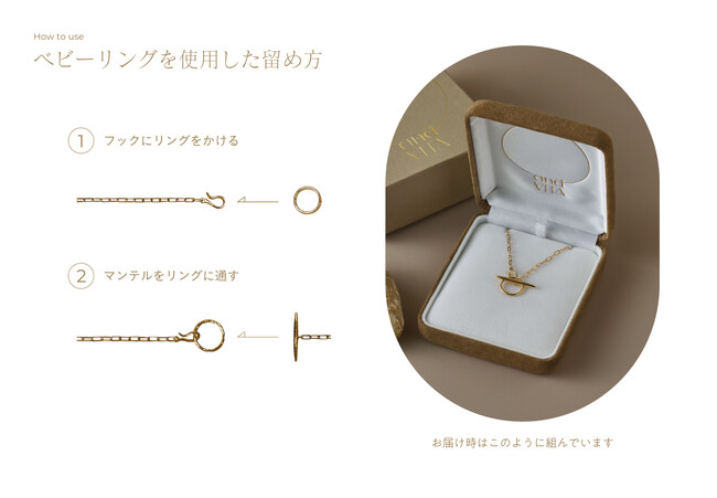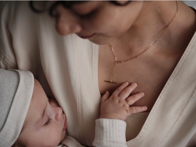 自由に服装を選べない妊娠期でもおしゃれを楽しめるように、美しく洗練された佇まいを目指しています。また生涯に渡って身につけていただけるように、素材はK18(18金)を使用し、ライフステージに合わせた様々なスタイリングをお楽しみいただけるデザインに仕立てました。