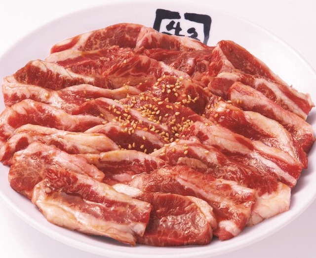 牛角カルビは鮮度の高い状態でお届けするために店内で1枚1枚丁寧にカットしています。ごはんに焼肉のタレ・青ネギ・韓国のりを合わせた「カルビ専用ごはん」との相性抜群。こんがり焼いたカルビをごはんに乗せ、豪快にかきこむのがおすすめです。