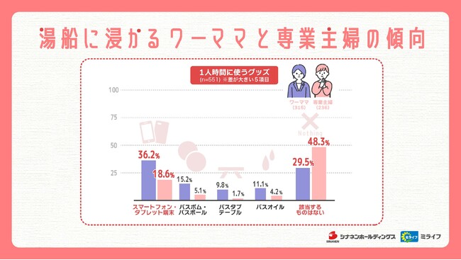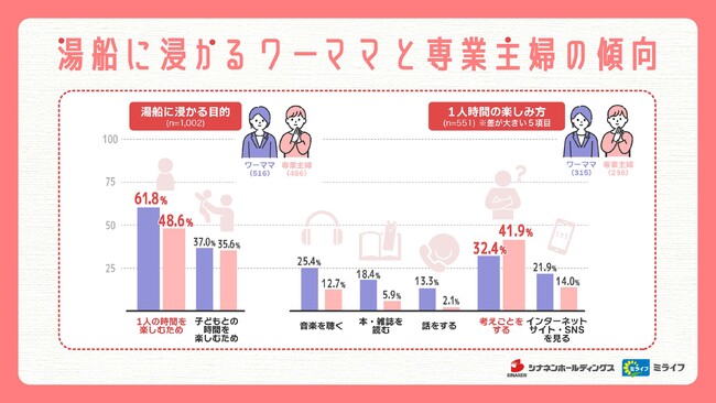 ワーママの6割が「1人の時間を楽しむため」に湯船に浸かり、専業主婦と湯船に浸かる時間の使い方に違いが見られる。