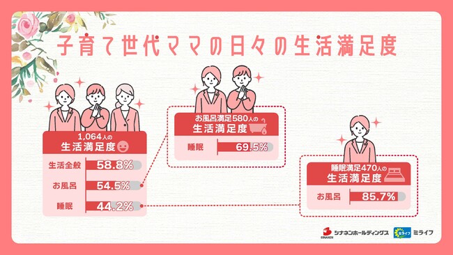 子育て世代ママの生活満足度は58.8%。お風呂生活満足度と睡眠満足度の間に関係性も伺える。