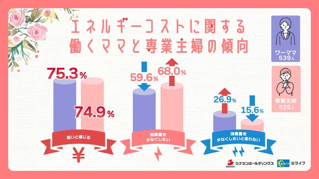 7割以上がエネルギーコストを高いと感じる一方、ワーママと専業主婦とでは、消費量を減らしたい意向に異なる傾向。