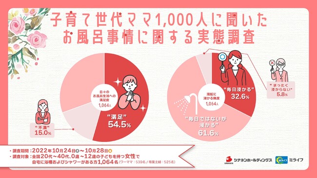 エネルギー・住まい・暮らしの総合サービス事業を提供するシナネンホールディングス株式会社(本社:東京都港区、代表取締役社長:山崎 正毅、以下 シナネンホールディングス)と、その子会社で関東エリアにおいてLPガス・電気・灯油等のエネルギー販売事業を展開するミライフ株式会社(本社:東京都港区、代表取締役社長:塚越 二喜男、以下 ミライフ)は、11月26日の「いい風呂の日」を前に、全国の子育て世代ママ約1,000人を対象に「お風呂事情に関する実態調査」を実施しましたので、調査結果をお知らせします。