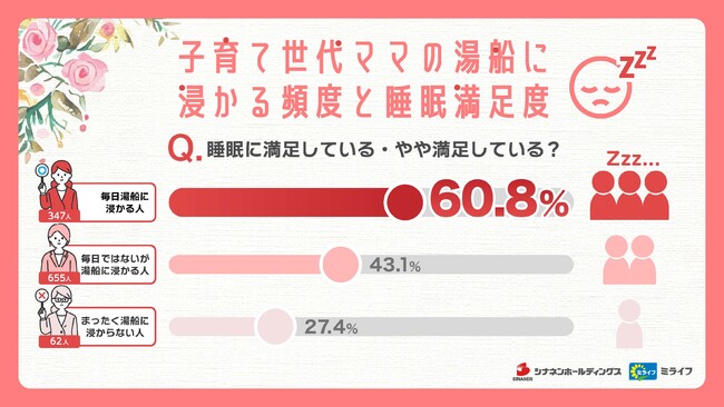 また、毎日湯船に浸かっているママ(n=347)と湯船に浸かる頻度が毎日ではないママ(n=655)、そして、まったく湯船には浸からないママ(n=62)の睡眠に関する満足度を見てみたところ、毎日湯船に浸かるママの睡眠満足度60.8%に対し、湯船に浸かる頻度が毎日ではないママは43.1%、まったく湯船には浸からないママは27.4%と、湯船に浸かる頻度が高いママは、睡眠への満足度も高い傾向が見られました。