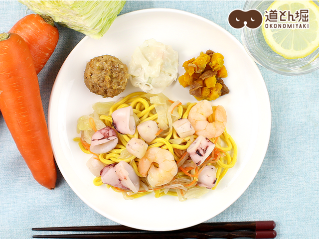 道とん堀オリジナル塩だれを使用した、海鮮たっぷりの塩焼きそばです。もちもちした食感の太麺にエビ、ヤリイカ、小柱の旨味が絡みます。キャベツ、もやし、人参の野菜とよく混ぜてお召し上がりください。