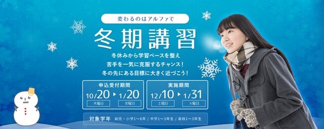 プロ講師による完全オーダーメイド指導の家庭教師や個別教室。勉強嫌い克服・成績アップ・受験対策など、1対1の完全個別指導でお子さまの「できたを増やす」株式会社アルファコーポレーション(本社:東京都豊島区、代表取締役:吉田俊泰)では、ただいま冬期講習を受付中!