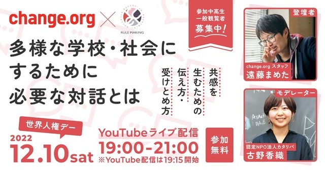 本イベントではChange.orgの署名キャンペーンにて自分の学校のみならず、地域の学校全体を変えたルールメイキング事例などを紹介する他「多様な学校・社会にするために必要な対話」について参加者の中高生・先生とともにディスカッションを行います。10代にとって身近にある社会を変えていくための、さまざまな対話の手段を知ることができるイベントです。