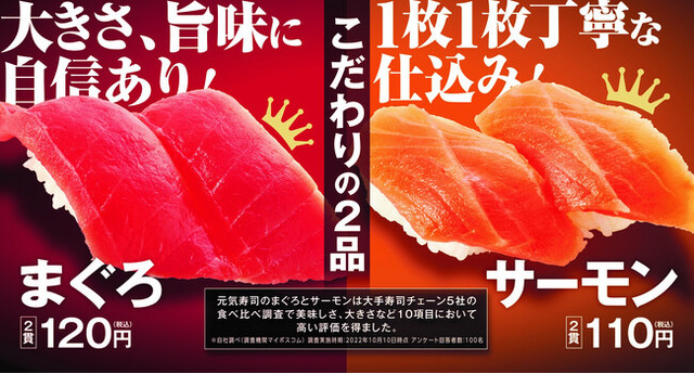 寿司レストランチェーンを展開する元気寿司株式会社(本社:栃木県宇都宮市 代表取締役会長兼社長 藤尾 益雄)が運営する”回転しない寿司“「魚べい」は、食べ比べ対象の回転寿司チェーン大手5社中1社以上の利用経験者100名を対象(※最頻利用店舗はほぼ均等に回収)に「回転寿司の寿司ネタに関する食べ比べ調査」を実施しました。その結果、魚べい自慢のネタ「まぐろ」と「サーモン」が「おいしさ指標」の10項目にて高い評価を獲得しました。選んで頂いた皆さまへの感謝の気持ちを込めて、11/30(水)からは中とろを一貫80円でご提供するなど豪華な商品を取り揃えた『創業祭』を開催いたします。