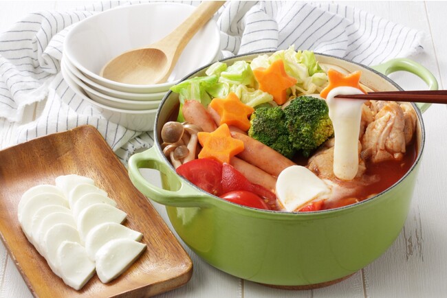 トマトのうま味とモッツァレラチーズのミルク感がよく合う、洋風鍋です。お子さまにも食べやすい甘みのある風味で、野菜がたっぷり食べられます。
