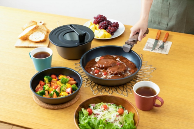 この度、コメリオリジナルブランド「Athena Life」からの取っ手が取れるフライパン・鍋シリーズ「高耐久コート フライパン・鍋 5点セット(IH・ガス兼用)」がリニューアルして登場いたします。金属ヘラ耐久性試験100万回をクリアした高耐久性能を持ち、シリーズのラインナップもフライパン3種類、鍋3種類、玉子焼きと充実。取っ手(ハンドル)を付け替えるだけで、お好きなサイズのフライパンや鍋としてお使いいただけます。重ねることでコンパクトに収納可能です。