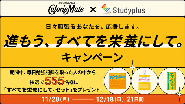 今回のイベントでは、学習管理アプリ「Studyplus」で「カロリーメイト」の公式アカウントをフォローして、イベント期間中に毎日勉強記録を付けた中学生・高校生の中から、抽選で555名様に「カロリーメイト "すべてを栄養にして。" セット」をプレゼントします。