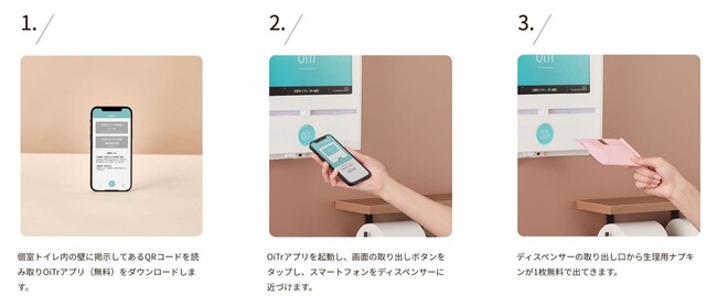 生理用ナプキンは日常的に必要なサニタリー用品ですが、トイレットペーパーとは異なり、無料で提供されていることは非常に稀です。OiTrは、トイレットペーパー同様に、生理用品が無料で行き届く社会にしたいという思いから生まれたサービスです。三井不動産グループは、オイテル社の「経済格差やジェンダーギャップといった不均衡の是正に寄与したい」という理念に共感し、商業施設にご来館されるお客さまがより楽しく安心してご利用いただく一助となればと考え、本サービスを導入しています。