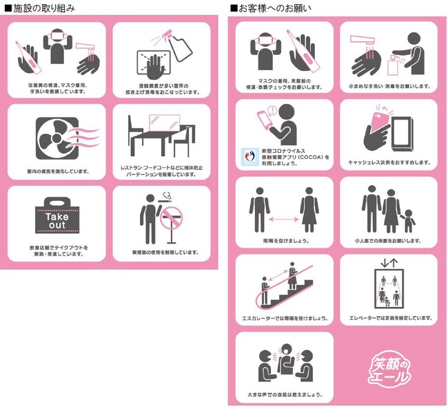 三井不動産グループが運営する商業施設では、新型コロナウイルス感染拡大防止のため下記をはじめとした様々な取り組みを実施しております。