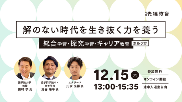 学校法人先端教育機構(東京都港区、理事長:東英弥)出版部が発行する教育専門誌「月刊先端教育」の主催で、小中高で実践が進む探究学習の教育現場の現状、改革、最新のカリキュラム事例をご紹介し、今後の探究学習のヒントとなるセミナーを12月15日(木)オンライン開催いたします。