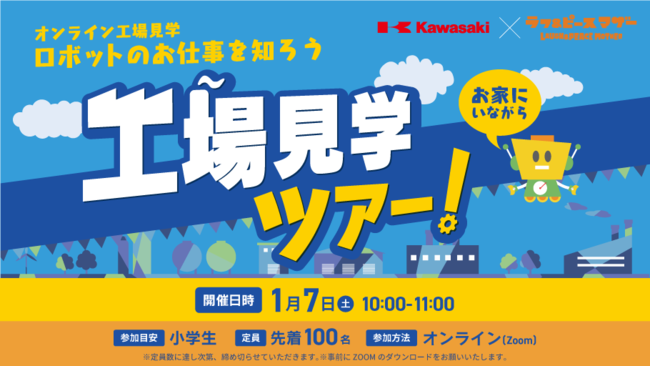 第一弾として、川崎重工業株式会社ロボットディビジョンとのコラボ型オンライン教室を2023年1月7日(土)に開催いたします。