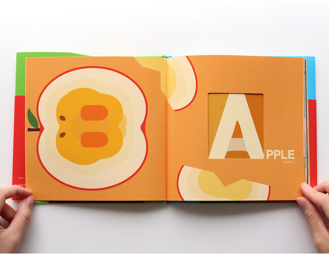 最初のページはこちら。左側にりんごの絵、右側に「A」(APPLE)の文字が書かれています。Aの文字は、穴から覗いています。