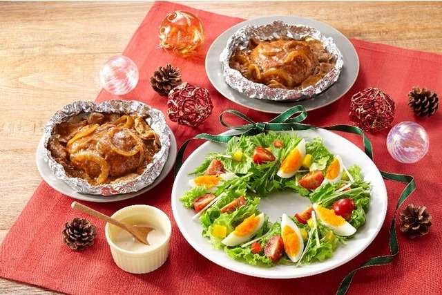 <主菜:洋食屋さん風★牛肉デミソースの包み焼きハンバーグ/副菜:クリスマス リースサラダ>