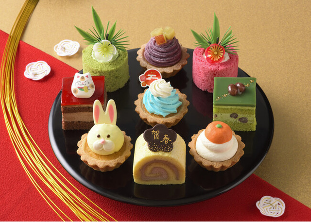 2023年の「スイーツ初め(R)」にぴったり!干支のうさぎや初日の出をモチーフにしたタルト、招き猫の飾りをのせたラズベリーのケーキなど、9種のプチケーキをおせちのお重をイメージしたボックスに詰め合わせました。