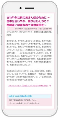 第一弾は、アストラゼネカと連携し、『母子モ』登録者のうち、妊娠中もしくは月齢12カ月以下の子どもの保護者に対し、アストラゼネカが専門医師の監修を受けて作成した早産児やRSウイルス感染症に関するポータルサイト「SmallBaby(https://www.small-baby.jp/ )」に収載されている情報の一部を『母子モ』にて配信します。