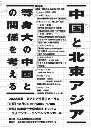 駐広島大韓民国総領事館主催、島根県立大学北東アジア地域研究センター協力により『2022年度 東アジア情勢フォーラム』を島根県立大学浜田キャンパス 交流センター・コンベンションホールにて開催します。今回のフォーラムでは『中国と北東アジア:等身大の中国との関係を考える』をテーマに、最新の情勢報告と討論が行われます。一般の方もご参加いただけます(事前申込不要)。
