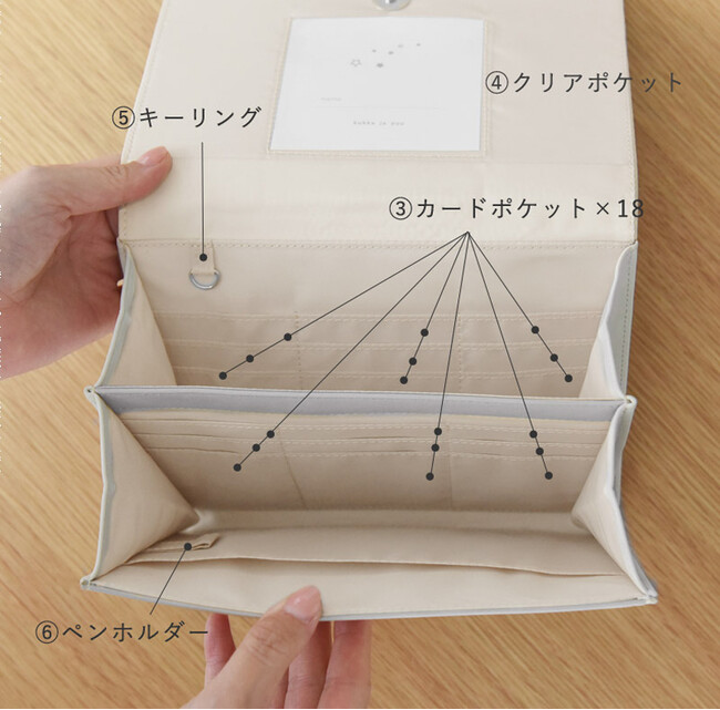 また、カードポケットもたっぷり付いているので、診察券などの定位置も決まり、すっきり仕分けが叶います。