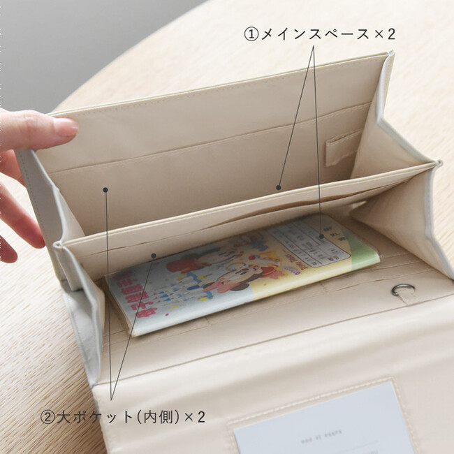 自治体によってサイズが異なる母子手帳も、こちらは大き目タイプのA5サイズまで対応。内側に仕切りが付いているので、子ども2人分の通院グッズも収納可能です。