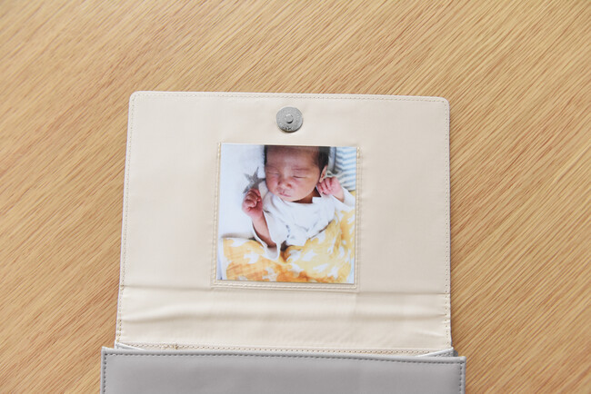 写真を入れられるクリアポケットを付けたのは、いつも緊張や不安と隣り合わせの産前産後に、きっとエコー写真や赤ちゃんの写真がママを励ましてくれるから。お守りを付けられるキーリングも、一人で通院する時に心細くないように。