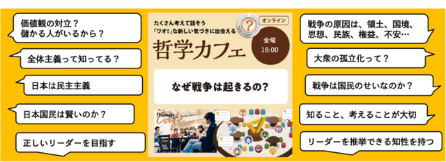 ワオ高校では、一人一人が哲学による気づきを通じて、自分の頭で「考え」、自信を持って「発言」できる力を磨けるような学びの場を増やしています。この「哲学カフェ」でも、中高生の皆さんが、山積する社会課題に自分事として向き合い、日本や世界の明るい未来を創っていけるようにリードして参ります。