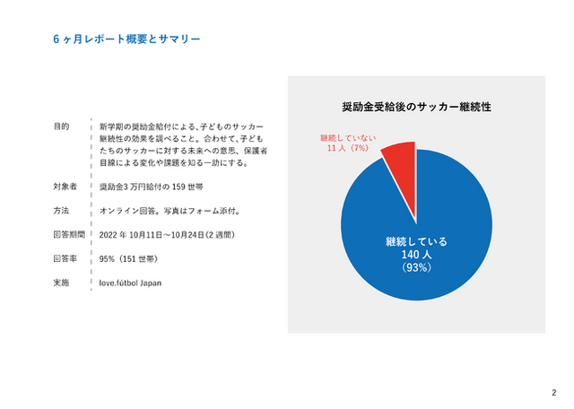 この「6ヶ月レポート」は、応援後の子どもたちの状況やサッカーの継続性、活動に対するニーズや改善点を確認するため、2022年度の奨励金受益者159世帯を対象に実施しました。