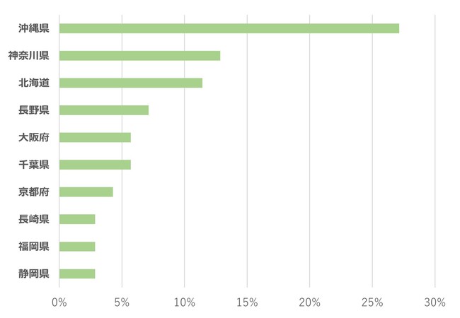 2位以降は、「神奈川県」、「北海道」と続き、「長崎県」「福岡県」「静岡県」が同率8位という結果になりました。