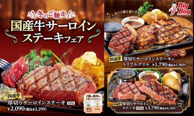 ぜひこの機会にお近くの「ビッグボーイ」「ヴィクトリアステーション」で、年末年始のご馳走「国産牛サーロインステーキフェア」をお楽しみください。