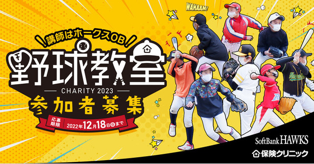 福岡ソフトバンクホークス2022年オフィシャルスポンサーの保険ショップ『保険クリニック(R)』は、1月29日(日)に雁の巣レクリエーションセンター 「少年野球場」 (福岡県福岡市)にて開催する小学生向けチャリティ野球教室の参加者を募集します。当日は福岡ソフトバンクホークスOBが講師となって直接子どもたちへ指導します。