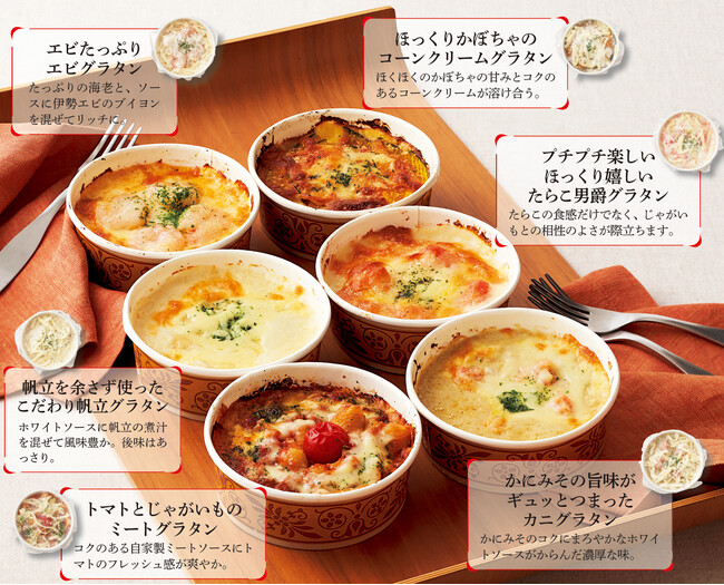 2022年、お客様から一番ご注文をいただいた人気第1位の商品は「北海道グラタン6種セット」。帆立・じゃがいも・牛乳といった、北海道の魅力的な食材をふんだんに使用した深い味わいに加え、小ぶりで食べやすいサイズがお子様やご年配の方にも好評を博しました。「北海道グラタン6種セット」5,832円(税込)。