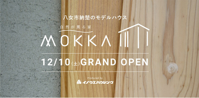株式会社イノウエハウジング(本社:福岡県八女市、代表取締役社長 井上正通)は、12/10(土)に八女市納楚に当社初となるモデルハウス「MOKKA(モッカ)」をオープンいたします。同モデルハウスは、当社の特徴である塗壁や無垢の板などの自然素材による“ぬくもりと住まい性能の高さ”を結集させた新ブランドです。このたび、「MOKKA」のオープンと合わせて八女出身のタレントである太田江莉奈さんをイメージモデルとして起用し、「八女出身の私が帰りたくなる家」をテーマに「八女の素材」にこだわったプロモーションを開始いたします。また、12/10(土)・11(日)には事前予約制にてオープニングイベントを開催。八女材を使用したオリジナルノベルティをはじめとしたプレゼントもご用意しておりますので、ぜひご予約の上ご来場ください。