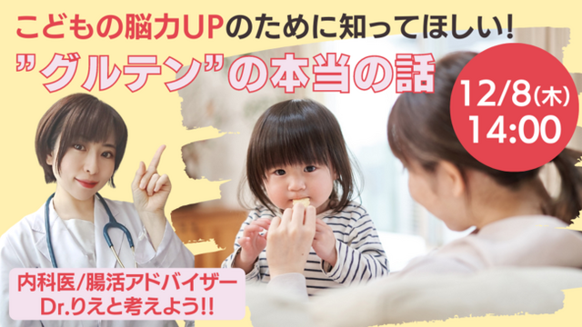 12/8(木)14:00~、現役内科医・腸活アドバイザーであるDr.りえこと奥理恵先生とこどもの「脳力」を引き出す食について考えませんか?今回のテーマは「グルテン」です。グルテンと脳は実は深く関係しています。脳の成長期であるこどもを持つパパママ世代にはぜひ知ってほしい情報を、ライブ配信でお届けします。ぜひ一緒に学びましょう!