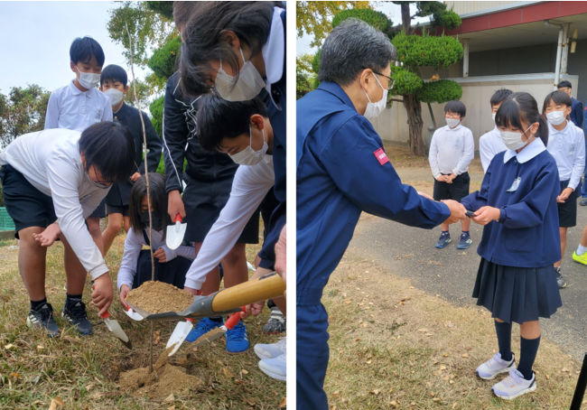 児童たちは、演奏に合わせて元気よく手拍子や三三七拍子をしていました。また、植樹式では桜の成長に必要なお世話について確認し、下級生に引き継ぐことを誓っていました。