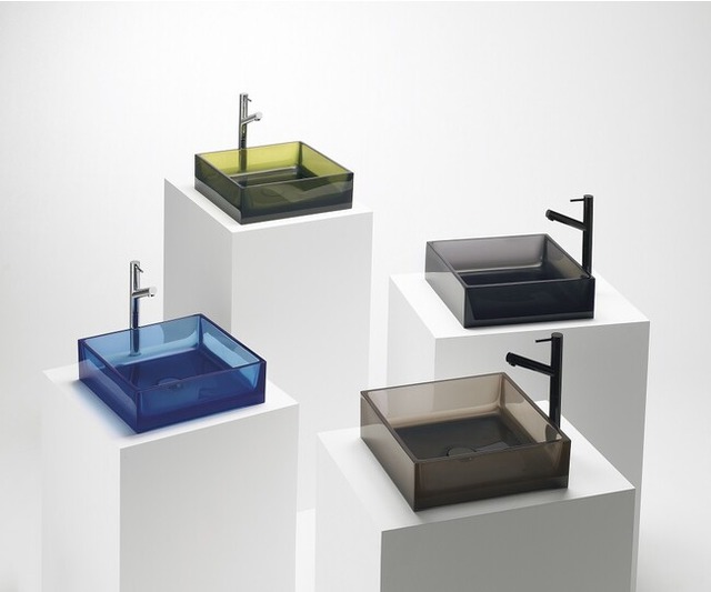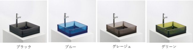 洗面ボウル《Cスルー》は、光や照明に映える透明感が特徴です。「ブルー」「グリーン」はシンプルな空間のアクセントに、「ブラック」「グレージュ」は様々なインテリアに調和する落ち着きのあるカラーです。「Cマテリアル」の特性を活かした縁の薄いシャープなスクエアデザインで、狭い空間に設置してもノイズになることなく、空間に広がりを感じさせます。