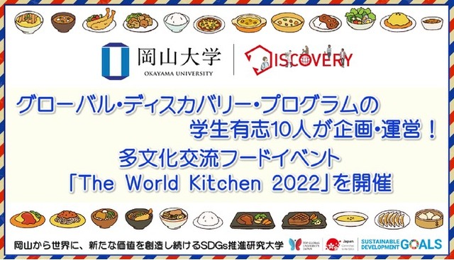 国立大学法人岡山大学(本部:岡山市北区、学長:槇野博史)は、2022年11月12日、グローバル・ディスカバリー・プログラム(GDP)の学生有志10人が実行委員会を立ち上げ、石山公園(岡山市北区)で多文化交流フードイベント「The World Kitchen 2022」を開催しました。