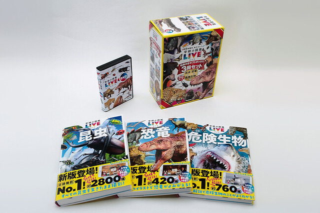 ギフト感を演出した豪華ボックスに、新版3冊『昆虫』『恐竜』『危険生物』が入っています。