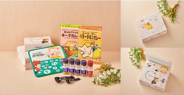 子どもが大好きなカレーを題材にしたスパイス付き絵本「レッツ・ゴー☆バターチキンカレー」、「みんなスマイル☆キーマカレー」の2冊に、レシピに使用する本格GABAN(R)ブランドの瓶入りパウダースパイス5種類、貝印株式会社の猫の形をした調理器具ブランド「Nyammy」のかわいい「ねこの計量スプーン」、キャラクターが描かれたオリジナルデザインの給水マットをセットにしました。外箱、中箱には絵本に登場するキャラクターがデザインされ、箱の内側には切り抜いて楽しめるすごろくもデザインされています。貰って嬉しい、親子で食育体験が満喫できるギフトボックスです。