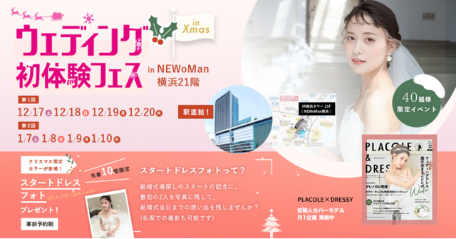 横浜駅直結、JR横浜タワーの21階、PLACOLE&DRESSY(プラコレ&ドレシー)の“体験型”花嫁相談カウンター【DRESSY ROOM】でスタートドレスフォトやDIY体験もできる!ウェディング初体験フェス in 横浜を開催いたします。安心のアクセス、商業施設NEWoMan横浜に直結ということもあり、お立ち寄りいただきやすい場所となっております。12/17(土)~20(火)の4日間で40組様無料ご招待での限定開催となっております。このフェスでは「あなたに合った内容」で様々なコンテンツを用意し、結婚式準備をサポートいたします。今回、クリスマスシーズンの開催にあたって、クリスマス限定のコンテンツや特典もご用意しています。