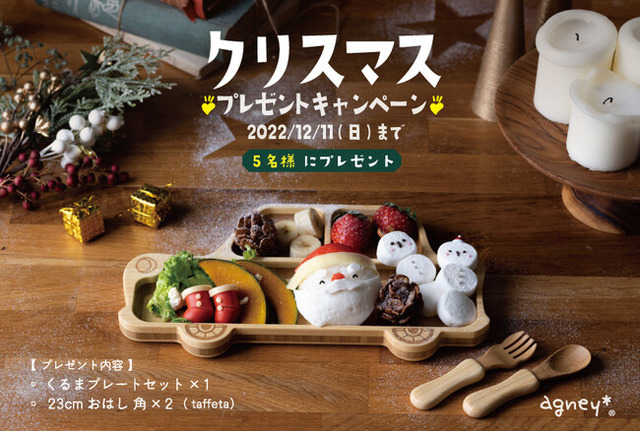 天然素材製品の製造販売を手掛ける仲吉商事株式会社(本社:埼玉県越谷市)は、ベビー・こども向けオリジナル食器の自社ブランド「agney*(アグニー) https://www.agney.jp」にて、★特別企画★クリスマスキャンペーンを開催!12月11日(日)正午までアグニー公式ブログ『豆ログ』にてご応募いただいた方5名様に「くるまプレートセット」「23cmおはし角(ハードメープル)」をプレゼントいたします。 (キャンペーン応募ページ▶︎https://www.agney.jp/blog/)