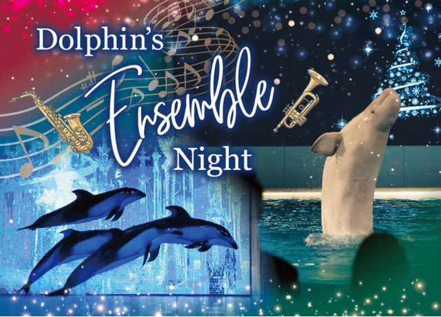 「Dolphin’s Ensemble Night」では、イルカによる迫力あるジャンプやシロイルカの優雅なパフォーマンスなどを普段とは異なる演出でお届けいたします。トランペット・サックス・ベース・ドラム・キーボードの五重奏で奏でるハーモニーが加わり、イルカたちとのセッションをご堪能いただけます。聖なる夜に、ご家族やご友人、大切な人と、幻想的なひと時をお過ごしください。