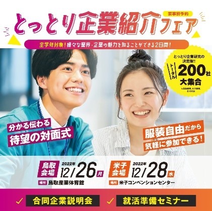 鳥取県・鳥取労働局(ハローワーク)・公益財団法人ふるさと鳥取県定住機構は、大学等に在籍する全学年の学生に対し、会社概要や業務内容等の情報提供を行うために、「とっとり企業紹介フェア」を2022年12月26・28日の2日間、鳥取市と米子市で対面式にて開催いたします。