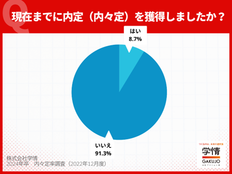 株式会社学情(本社:東京都千代田区)は、2024年3月卒業(修了)予定の大学生・大学院生を対象に、就職活動に関するインターネットアンケートを実施。今回は、「内々定の獲得状況」をテーマに調査しました。2022年11月末時点の内々定獲得率は、8.7%。前年同時期の6.2%を2.5ポイント上回りました。10社以上のインターンシップに参加した学生は33.8%にのぼり、早くも多くの学生が意欲的に就職活動に取り組んでいることが分かります。また、内々定企業の規模は従業員数“5,000人以上”が40.0%で最多という結果に。規模の大きい企業ほど早い段階で内々定出しを行っているとうかがえます。