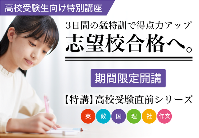 ※2022年度中学生テキストコース中3講座を受講されていた方は、一部講座内容が重複するため、「高校受験直前シリーズ」の同科目はご受講いただけません。