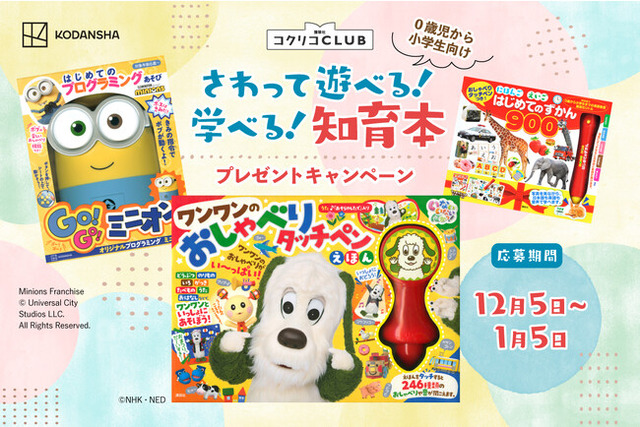 文字や写真をおすと音が流れるタッチペンや、「ミニオン」の遊んで学べるプログラミング知育ロボット、すみっコぐらしのきらきらスライムムックなどさわって遊べて、楽しい仕掛けがいっぱい!大人気の知育玩具本を計21名様にプレゼント。全7タイトルからお好きな1冊を選んでご応募ください。応募にあたっては「講談社コクリコCLUB」への会員登録が必要となります(無料)。
